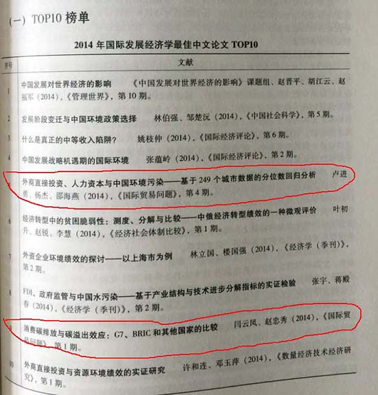 据中国社会科学院《世界经济年鉴》编辑部消息,我院发表在《国际贸易问题》上的2篇研究成果《外商直接投资、人力资本与中国环境污染——基于249个城市数据的分位数回归分析》和《消费碳排放与碳溢出效应:G7、BRIC和其他国家的比较》获评“2014年国际发展经济学最佳中文论文TOP10”,分别位列第5名和第9名,入选《世界经济年鉴》2015卷。