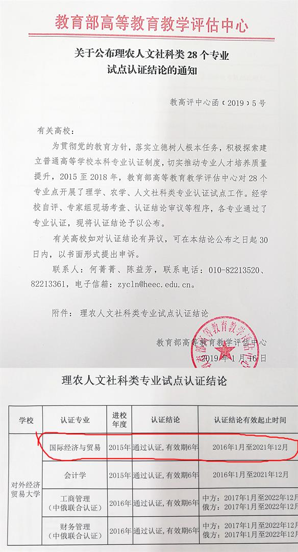 日前,接获教育部高等教育教学评估中心的正式通知,经学校自评、专家组现场考查、认证结论审议等程序,国际经济与贸易专业正式通过教育部理农人文社科类专业认证,有效期六年。
