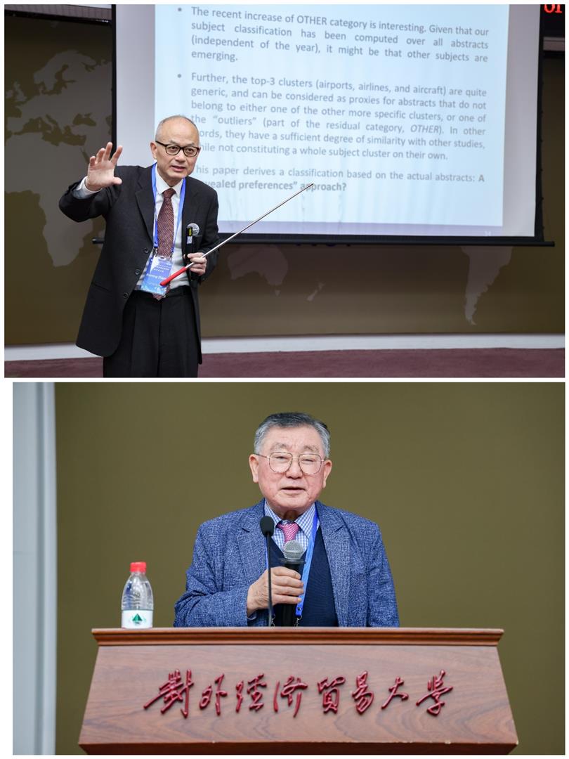 ![]() 本届会议主要聚焦于民航领域,包括主题报告、世界航空运输学会中国分会成立仪式和研讨会三个议程。其中,主题报告会共三个阶段,分别由对外经济贸易大学中国交通运输经济研究中心主任蒋昌敏教授、香港理工大学助理教授王焜和对外经济贸易大学助理教授李翊良主持。来自国内外高校共7位知名民航领域专家作了报告。世界航空运输学会主席、加拿大英属哥伦比亚大学讲席教授张安民首先进行演讲。张教授介绍了近10年世界航空运输学会年会发展情况,用详实的数据分析了近年来航空运输领域的高频热点、突出贡献学者和院校、合作网络等,并指明了航空运输研究具有潜力的方向。世界交通研究大会主席、加拿大英属哥伦比亚大学讲席教授Tae Hoon Oum介绍了他近年来在航空自由化与服务贸易领域的研究,他与合作者基于引力模型,针对美国、加拿大和中国三个具有不同发展程度的航空市场,采取了差异化实证策略,检验了航空自由化对一国服务贸易进出口的效果。
