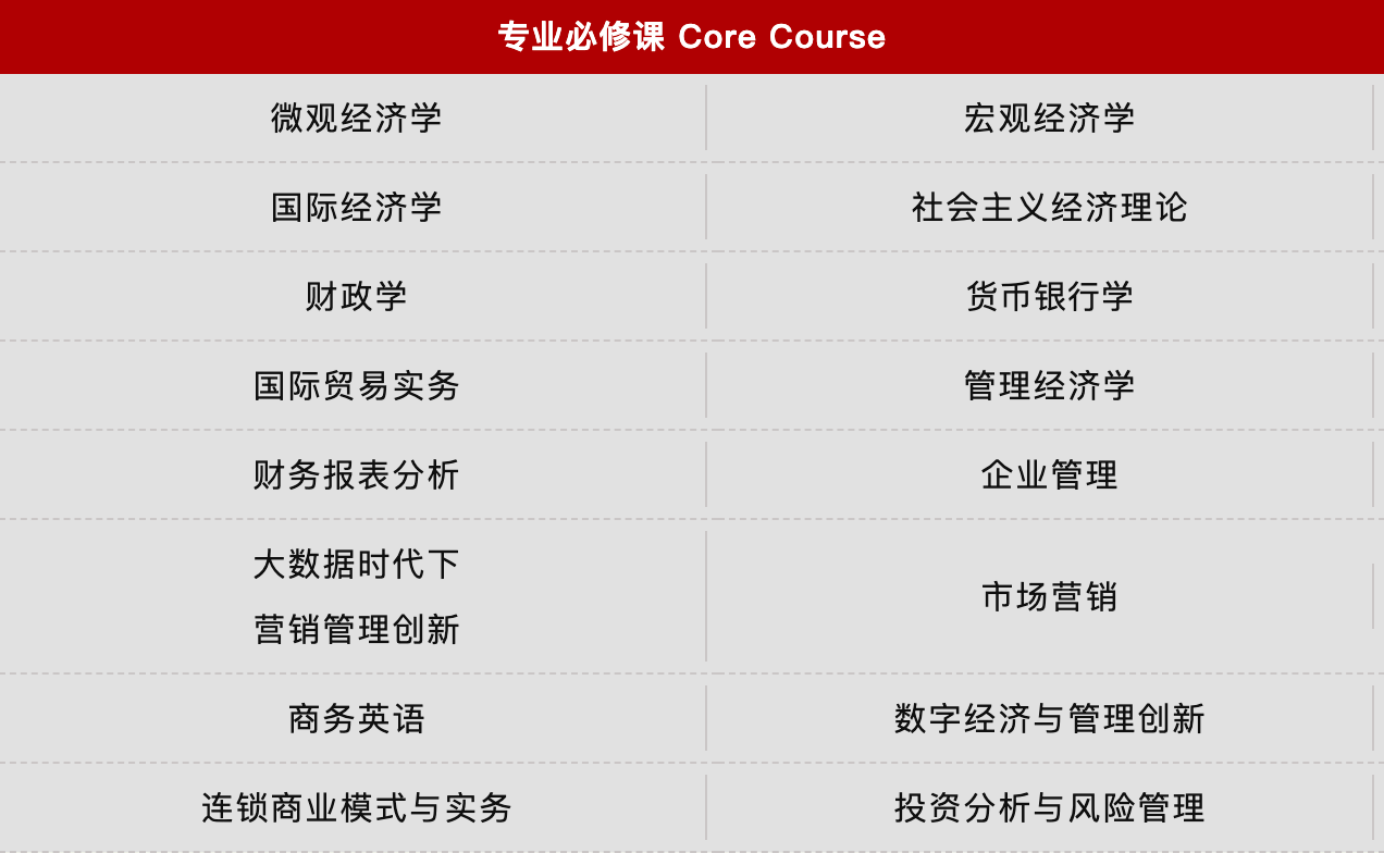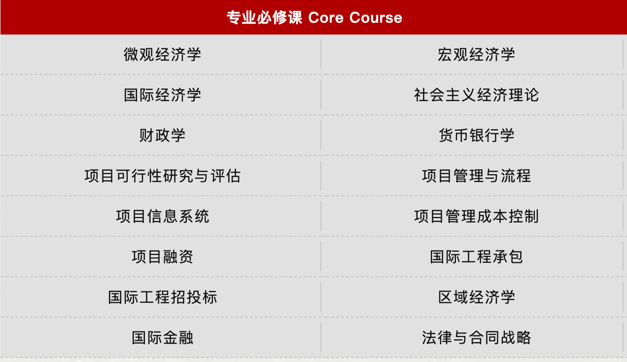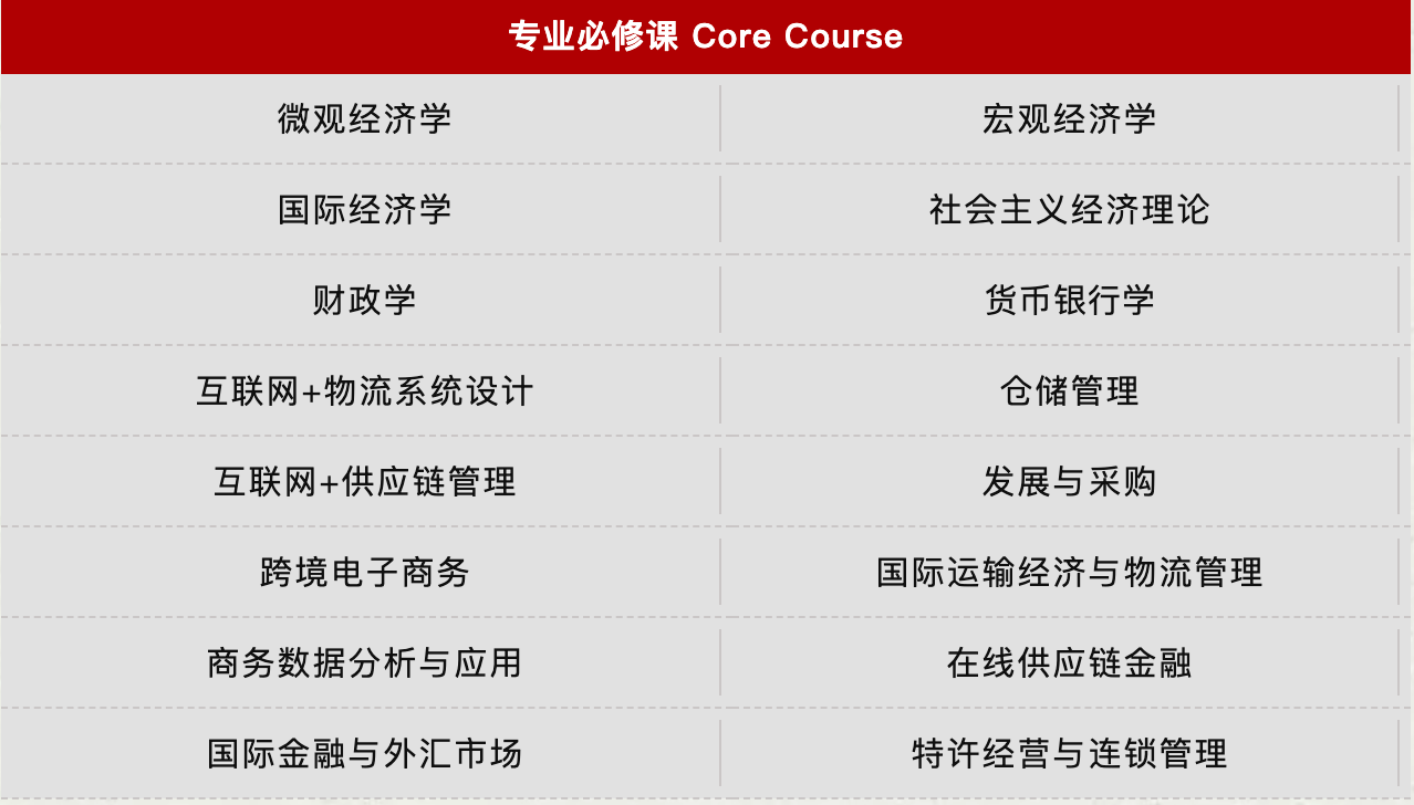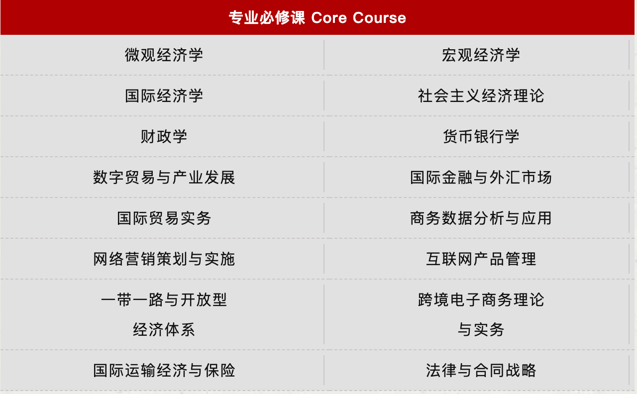 三、招生专业及课程设置 国际贸易学专业(数字贸易与实务方向) 国际贸易学专业(现代物流与供应链管理方向) 国际贸易学专业(国际项目管理方向) 产业经济学专业(商业经济与企业管理方向) 产业经济学专业(数字经济方向) 金融学专业(金融风险管理方向) 金融学专业(金融管理与投资实务方向) 注:课程模块会根据培养方案及学生需求适时调整,以实际授课安排为准。