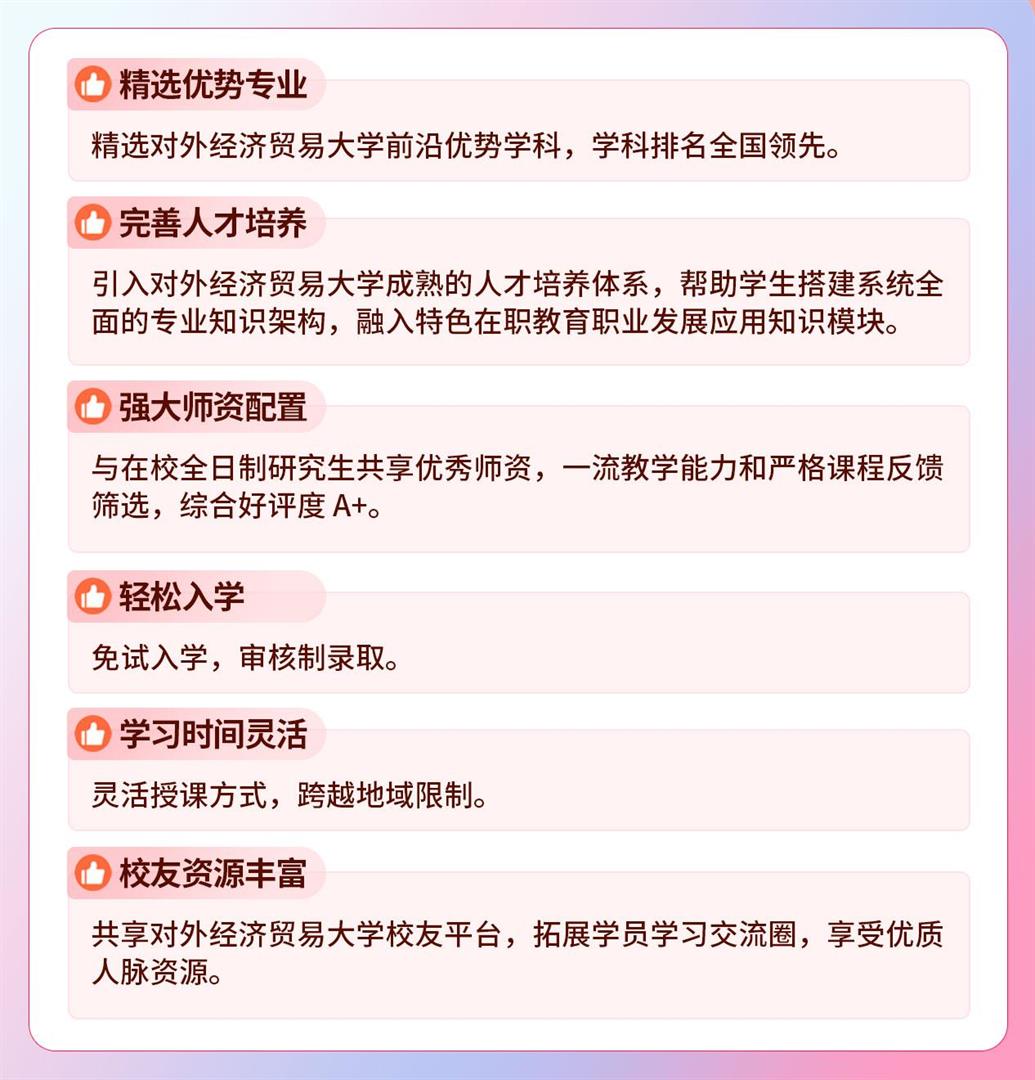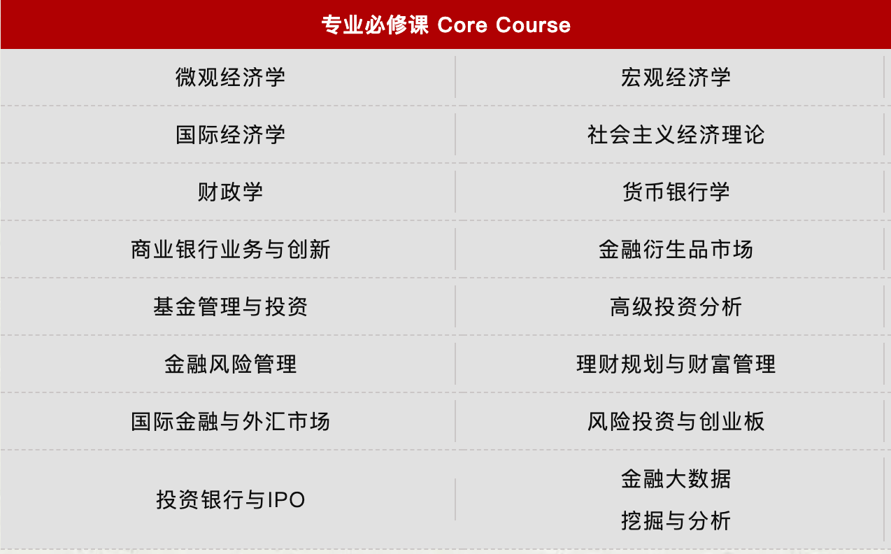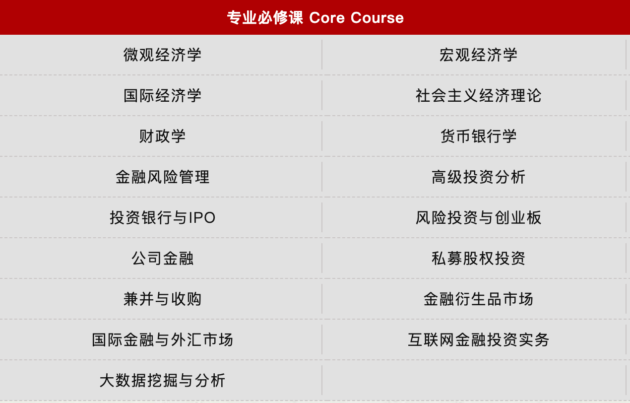 三、招生专业及课程设置 国际贸易学专业(数字贸易与实务方向) 国际贸易学专业(现代物流与供应链管理方向) 国际贸易学专业(国际项目管理方向) 产业经济学专业(商业经济与企业管理方向) 产业经济学专业(数字经济方向) 金融学专业(金融风险管理方向) 金融学专业(金融管理与投资实务方向) 注:课程模块会根据培养方案及学生需求适时调整,以实际授课安排为准。